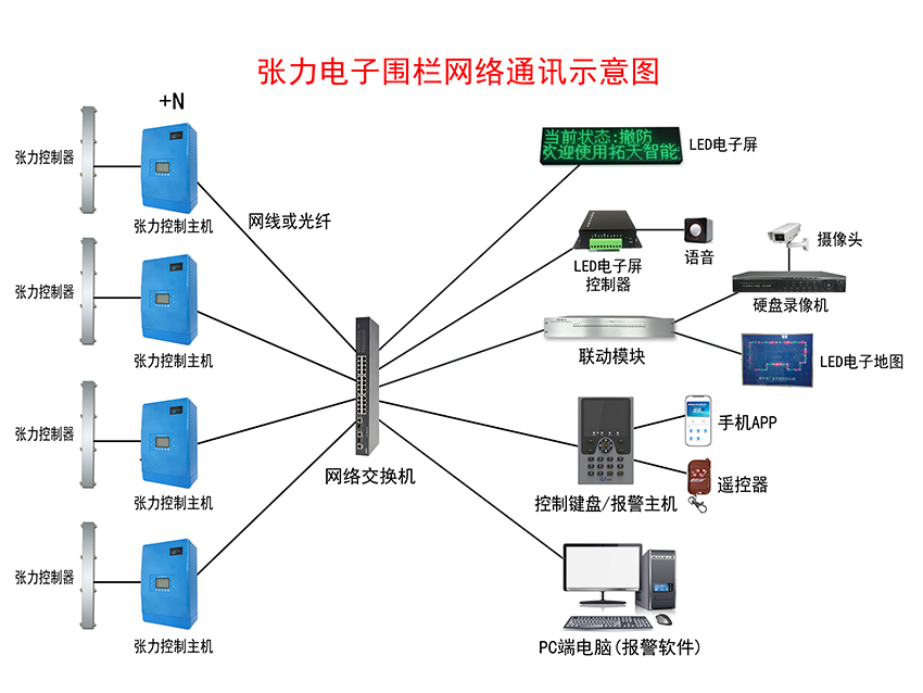 張力電子圍欄報警系統示意圖——網絡通訊+LED電子屏+語音