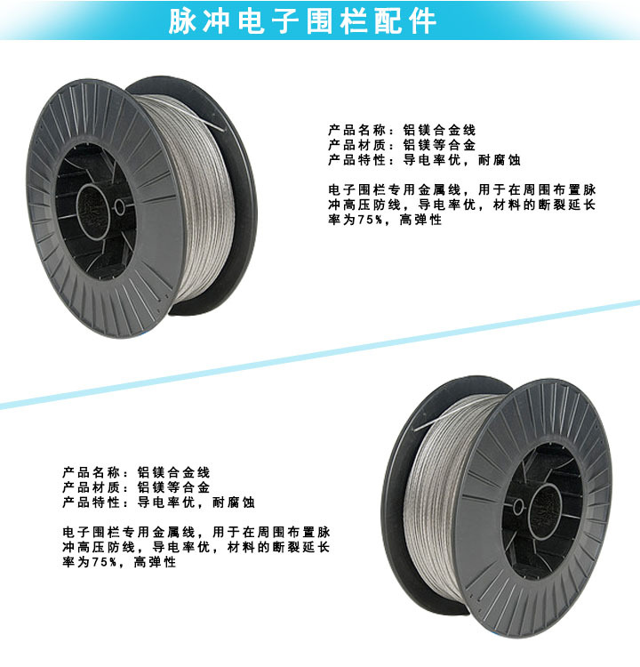 材質(zhì):鋁鎂等合金;電子圍欄專用金屬線,導電率優(yōu),耐腐蝕,用于高壓脈沖電子圍欄,材料斷裂延長率75%,高彈性