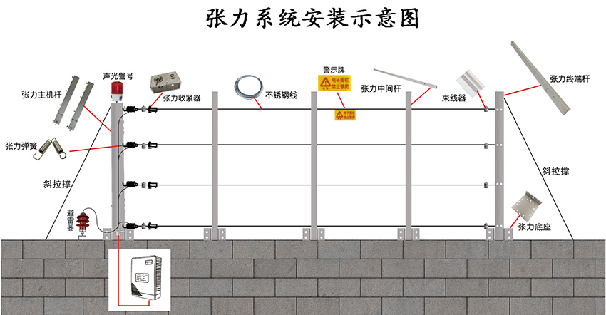 現在來說下張力電子圍欄,前面也說了張力圍欄和脈沖圍欄最大的區別就是張力圍欄不具備有高壓脈沖電擊功能,報警和阻擋同樣具備了。張力圍欄的報警方式是當前端的圍欄的拉力值發生了改變就會產生報警信號。由于張力圍欄是一種物理性的報警方式,所以張力圍欄的每個的防區控制長度就相對較短一般在40米以內為一個防區。由于防區控制長度較短,在同周長的項目上整體的造價成本相比脈沖圍欄要高一些。